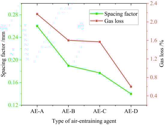 Atahan et al. [56] compared the influence of four different types of air-entraining agents on the pore distribution and bubble spacing coefficient of fresh concrete after bubble hardening. The bubble spacing coefficient is an important parameter for evaluating concrete frost resistance. Figure 14 shows that bubbles introduced with different types of air-entraining agents have varying sizes. Comparative analysis with Figure 15 found that the introduction of more tiny bubbles better helped to reduce the bubble spacing coefficient of concrete, thereby improving concrete frost resistance.