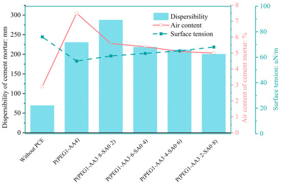 Sulfonic acid group. When a small number of sulfonic acid groups was used to replace the carboxyl groups in the main PCE chain, the fresh mortar with sulfonic acid group-containing PCE had a significantly increased or decreased air void of 5–6%, as shown in Figure 17 below [63]. As the sulfonic acid group gradually increased, the air-entrainment amount in the cement mortar gradually decreased because more sulfonic acid groups would lead to an increased concentration of PCE adsorbed on the cement particle surface. With it, the concentration of the residual PCE in the pore solution decreased, thereby reducing the surface tension of the gas–liquid interface so that the air void introduced into the cement mortar decreased. Therefore, PCEs with sulfonic acid groups have low air-entraining performance.