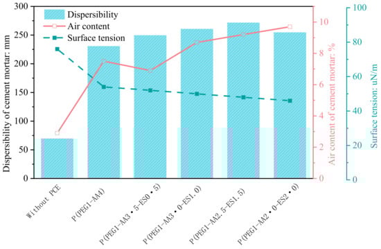 In recent years, some scholars have synthesized low air-entraining PCEs by adjusting the molecular structure or molecular weight of PCE, such as by introducing the antifoaming functional group, PPGA400 (poly (propylene glycol) diacrylate), into the molecular structure [64] using the aqueous solution radical polymerization method to adjust the synthesis of PCE with different acid-to-ether ratios [62] or by performing graft random copolymerization of EO/PO (ethylene oxide/propylene oxide copolymer) polyether side chains on the main chain [65], etc. The above experimental methods have respective advantages and disadvantages. By molecular shearing, it is possible to reduce the gas content, effectively inhibiting the bubble generation, but the synthesis process is relatively complicated. After the grafted ester group enters the side chain, PCE has a lower surface tension, which can significantly improve the air-entraining ability and change large bubbles into small bubbles. PCE with sulfonic acid groups inserted in the main chain cannot optimize the pore structure of concrete, with a large number of macropores still present in the hardened cement mortar [63]. Therefore, how to use the above experimental methods to optimize the PCE molecular structure is still worthy of further study.