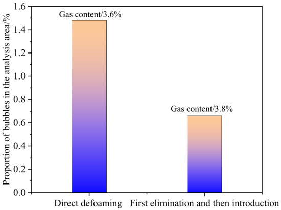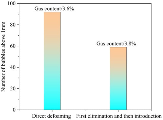 Bubble parameter is an important condition for establishing bubble structure as an important index affecting the concrete appearance. There are generally three parameters to characterize the bubble structure: gas content, average bubble diameter, and bubble spacing coefficient. Bubble structure is commonly controlled by the control of raw materials, adjustment of the mixing ratio, and composite mixing of chemical admixtures, among which the use of admixtures is the most efficient [66]. Under the basically consistent working performance, the effects of two traditional air void control methods, direct defoaming and first elimination and then introduction, on the apparent bubbles of hardened concrete were studied. The research results of Puthipad et al. [67] are shown in Figure 19 and Figure 20. Using the control method of “first elimination and then introduction”, the ratio of bubble area to the analysis area and the number of bubbles above 1 mm were greatly reduced, which played a significant role in improving the concrete surface appearance. The composite mixing of defoamer and PCE superplasticizer greatly affected the bubble spacing coefficient and bubble pore-size distribution of the concrete [68,69], among which the foaming and foam stabilization properties of the air-entraining agents played the most important role in affecting the concrete appearance [70]. A comprehensive comparison of Figure 21 reveals that the combined use of chemical admixtures can achieve a dynamic balance between improving and reducing workability, optimize the bubble structure, and enhance the bubble stability, thereby improving the concrete appearance quality [32].