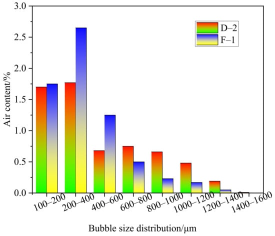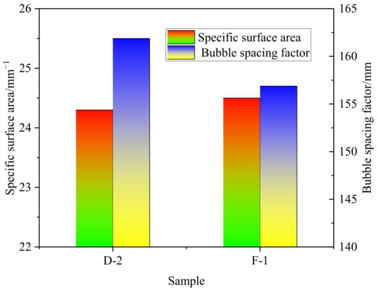 Both durability and construction quality of concrete are affected by its rheological properties [71]. Guo et al. [72] reported the characteristic analysis of air bubbles on the rheological properties of fresh cement mortars and indicated that the bubble deformation decreases yield stress and plastic viscosity of the mortars. Using the NXS-11B rotational viscometer, Zhang et al. [73] measured the mortar plastic viscosity and yield stress and analyzed the influence mechanism of bubble characteristic parameters on rheological properties. The results showed that, with concrete specimens D-2 and F-1 as comparison samples as shown in Figure 22 and Figure 23, F-1 contained more bubbles when it was 10–600 μm, with a large number of tiny bubbles playing a lubricating role, which reduced the friction between the concrete components, thereby reducing the mortar yield stress and plastic viscosity. The tiny bubbles can separate the cement particles and decrease the degree of mutual colloidal interactions, which in turn breaks the cross-linked network and improves the rheological properties of concrete [74]. Figure 24 shows that the bubbles in F-1 have a smaller spacing factor and a larger specific surface area. At this time, a strong interaction occurred between the electrostatic repulsion generated by the same charge of the liquid films on the bubble surface so that the bubbles were uniformly dispersed in the concrete, which reduced the probability of small bubbles coalescing into large bubbles.