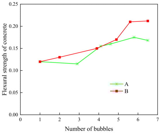 There are generally two or more flow states involving mixtures of different phases in nature; the most common is the gas–liquid two-phase flow state. In this process, bubbles play an important role [4]. Bubbles in concrete can be divided into water bubbles, air bubbles, etc. [5]. Blisters usually appear when the cement amount is small, a phenomenon caused by water cavities formed by the later evaporation of water wrapped in the flocculation structure. Bubbles as inherent bubbles in concrete mixtures are mainly formed due to oily release agents, unreasonably graded aggregates, and stirring. Normally, the bubbles introduced by the PCE superplasticizer are irregular and unstable, which are more likely to lead to coalescence during concrete vibration and transportation and are harmful bubbles. The bubbles introduced by the air-entraining agent have a dimension of 20–200 μm, which are relatively stable and have firm liquid film to effectively prevent the aggregation, and belong to beneficial bubbles [6].