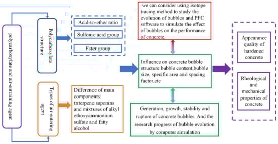 The traditional experiment process consumes a lot of time and energy. Nowadays, given the rapidly developing network and computers, developed computer technology can be used to establish appropriate models which provide an intuitive and low-carbon experiment approach to simulate the progress of related experiments and finally reveal the evolution and regulation mechanism of concrete bubbles under the action of PCE. Focusing on the concrete bubble research by domestic and foreign scholars, this paper summarizes the effects of air-entraining agents and the PCE superplasticizer structure on bubbles, as well as the effect of bubbles on concrete properties. Moreover, it anticipated experimental methods and mathematical models for future research of bubble mechanisms. Our research can be reflected in Scheme 1.