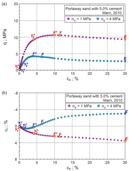 The mechanical behaviour of artificially cemented Portaway sand at high pressures was investigated by Marri [10]. The results of two drained triaxial compression tests of Portaway sand with a 5% Portland cement content at confining pressures and were analysed in detail to determine the characteristic stages of shearing. The relationships and obtained in the tests were sectionally approximated by a high degree of polynomials. The elastic parts of the strain increments were calculated using the formula: