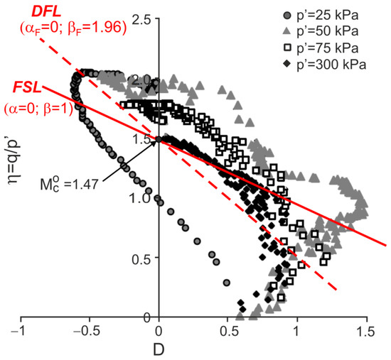 For the undrained triaxial compression tests, the ultimate states (Figure 6) correspond to the critical frictional states () defined by the intersecting DFL with the vertical axes in the plane for the drained triaxial compression tests (Figure 5). The dilatant failure states are represented by characteristic points of the stress path in planes (Figure 6) for the undrained triaxial compression tests. Parameters and could not be determined based on the data shown in [10].