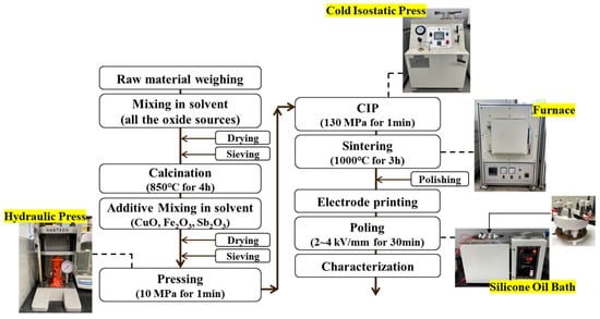 The composition formula (0.20−x)Pb(Zn1/3Nb2/3)O3-xPb(Mn1/3Nb2/3)O3-0.80Pb(Zr1−yTiy)O3 (PZN-PMN-PZT, x = 0.02~0.18, y = 0.5~0.54) + 0.3 wt.% CuO + 0.3 wt.% Fe2O3 was used in this study. Figure 1 shows the process flow chart for the fabrication of the PZN-PMN-PZT ceramics. The weight of the raw material powder depended on the composition ratio, and it was mixed in an ethanol solvent for 24 h using a ball mill and then dried to obtain a uniform powder. Subsequently, calcination was carried out at a constant temperature of 850 °C for 4 h, and a certain amount of Sb2O3 dopant in the range 0.1–0.7 wt.% was added and mixed for an additional 24 h. An appropriate volume of 10 wt.% poly vinyl alcohol (PVA) aqueous solution was added to the powder as a binder, and a pressure of approximately 10 MPa was applied to form a 20 mm diameter disk. The molded specimen was subjected to a water pressure of 130 MPa for 1 min using a cold isostatic pressing (CIP) process. The sintering was performed at 500 °C for 1 h to remove the binder and then at 1000 °C for 3 h. The degree of densification was confirmed by observing the microstructure of the sintered specimen using a scanning electron microscope (Nova Navo SEM 450, ThermoFisher, Waltham, MA, USA), and the crystallographic structure was analyzed at a diffraction angle from 20 to 60° using an X-ray diffraction analyzer (XRD, BRUKER, Billerica, MA, USA).