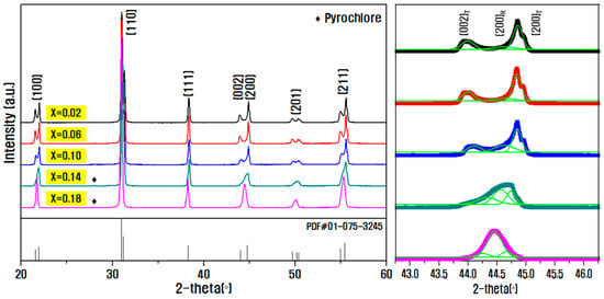 Figure 2 shows the X-ray diffraction pattern of the sintered ceramic according to the composition ratio of PZN and PMN in the (0.20−x)PZN-xPMN-0.80Pb(Zr0.5Ti0.5)O3 (x = 0.02–0.18) ceramic. From the diffraction pattern analysis results, it can be seen that stable perovskite structures without secondary phases were formed in all composition ranges of ceramic. The enlargement of the diffraction pattern in the 2-θ range 44–46° shows the formation of (200)R rhombohedral diffraction peak between the tetragonal (002)T and (200)T peaks with increasing molar ratio of PMN. This phenomenon occurred mainly because Mn4+ ions were partially reduced into Mn2+ (0.82 Å) or Mn3+ (0.65 Å) during the sintering process substituting the Zr4+ (0.72 Å) or Ti4+ (0.61 Å) position at the B-site in the perovskite structure. The lattice was distorted because of the large radius of the Mn ion, and as the movement of ions became more difficult because of the stuffing effect, the phase transition from rhombohedral to tetragonal slowed down, thus stabilizing the rhombohedral phase [18,19,20].