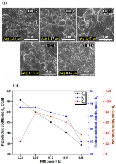 The SEM image in Figure 3a shows the microstructure of fracture surfaces of the sintered ceramic according to the composition ratio of PZN and PMN, while the average particle size was calculated using linear intercept analysis. As the anisotropy of crystal structure decreased because of the PMN substitution, the crystal grains grew, resulting in a maximum value of the average particle size at x = 0.10 of 1.47 μm. For x ≥ 0.14, the pores increased, and the growth of grains was inhibited because of the distribution of the impurities that could not be dissolved beyond the solubility limit in the grain boundary layer [22,23,24]. Figure 3b shows the measurement results of electrical properties according to the composition ratio. As the PMN content increased, the piezoelectric coefficient and electromechanical coupling coefficient decreased. On the other hand, the mechanical quality factor increased until x = 0.06, and its value decreased thereafter. This might occur because the space charge increased as the oxygen ion vacancies located at the face center of the perovskite lattice were created to maintain electrical neutrality during the Mn ion substitution for B-site in the perovskite lattice. This further resulted in an increase in the internal electric field within the particle, and the domain motion was suppressed by this electric field, resulting in a decrease in polarization efficiency. The decrease in the mechanical quality factor at x ≥ 0.10 may be attributed to the rapid decrease in density [20,25,26,27].