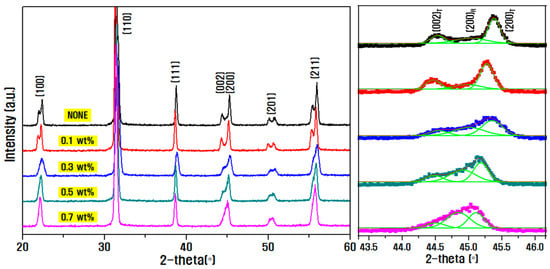 Figure 4 shows the X-ray diffraction patterns according to the amount of Sb2O3 dopant in the basic composition of 0.14PZN-0.06PMN-0.8PZT. It can be seen that the (200)R diffraction peak between 44 and 46° gradually increased with the Sb2O3 dopant content. This might be because the Sb3+(0.76 Å) ion with a similar radius occupied the high-valence Zr4+(0.72 Å) ion site, thus stabilizing the isotropic rhombohedral phase [28].