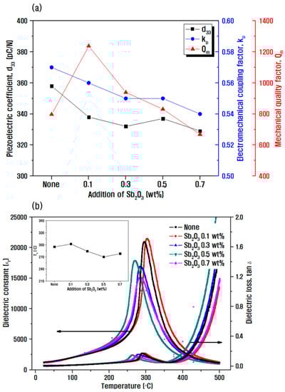 Figure 5 shows the results of the study of electrical properties according to the amount of Sb2O3 dopant. As the amount of Sb2O3 increased, the piezoelectric coefficient and the electromechanical coupling coefficient decreased, and on the contrary, the mechanical quality factor tended to increase in Figure 5a. The decrease in poling efficiency may be attributed to the decrease in domain mobility when the Sb3+ ion replaced the high-valence Zr4+ position at B-site, similar to the Mn ion substitution effect described in Figure 3b [29,30]. The mechanical quality factor exhibited a maximum value of 1237 for Sb2O3 0.1 wt.%, and it gradually decreased as the added amount increased over 0.3 wt.%. The increase in the amount of additive resulted in more defects, such as oxygen vacancies, in the sintered body, and deterioration in the density and the mechanical quality factor [27]. Figure 5b shows dielectric properties according to the temperature change at 1 kHz measurement. The maximum Curie temperature, which is the temperature at the maximum permittivity value, was 302 °C at 0.1 wt.% Sb2O3. However, the further addition of Sb2O3 resulted in the decline of curie temperature and this phenomenon may be related to the lattice anisotropy decrease with the increase of Sb2O3 content [30].