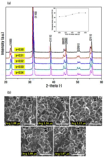 Figure 6 shows the X-ray diffraction pattern and SEM image of the fracture surfaces according to the Zr/Ti composition change (y = 0.5–0.54) in the 0.14PZN-0.06PMN-0.80PbZr1−yTiy·0.1 wt.% Sb2O3 ceramic. No secondary phase was seen in the diffraction pattern of all compositions in Figure 6a. As the Zr/Ti ratio decreased, the peaks of tetragonal (002), (200), and rhombohedral (200) on the diffraction pattern in the 2-θ range 44–46° were clearly split, confirming the phase transition from rhombohedral to tetragonal. The tetragonal phase fraction calculated based on the comparison of the relative intensity ratios of the splitting peaks indicated an increase from 82% at the Zr/Ti ratio 50/50 to 90% at the 46/54 composition, and this may be attributed to the tetragonal PbTiO3. In general, the MPB (morphotropic phase boundary) region of pure PZT is near the Zr/Ti ratio 53/47, while in this composition, the lattice constant was altered and the MPB region was slightly shifted toward Ti-rich because of the substitution of Zn2+(0.74 Å), Mn2+(0.82 Å), Nb5+(0.64 Å), and Sb3+(0.76 Å) elements for the B-site of the perovskite structure [31,32,33]. From Figure 6b, it can be confirmed that all compositions possessed a dense structure without pores, and the particle size increased from approximately 1.08 μm at the Zr/Ti ratio 50/50 to 1.16 μm at the 49/51 ratio. Further, as the Zr/Ti ratio decreased, the particle size was slightly reduced because of the increase in the anisotropy of the crystal lattice and the stress inside the lattice caused by the enhancement of tetragonal phase, thus inhibiting the growth of crystal grains [34]. However, there was no significant difference according to the Zr/Ti composition ratio.