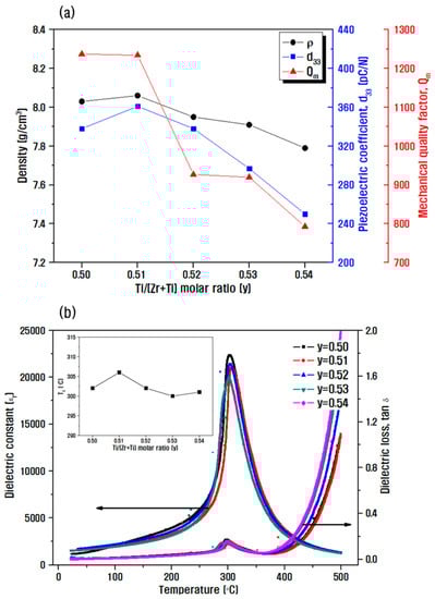 Figure 7 shows the results of the density and electrical properties measurement according to the Zr/Ti composition change. In Figure 7a, the maximum density under a decreasing Zr/Ti ratio is 8.06 g/cm3 and relative density is around 99% at the composition ratio of 49/51. Thus, the density value decreased slightly as the particle size decreased. In addition, as the composition of PbTiO3 with high-anisotropy crystal lattice increased, it approached the morphotropic phase boundary region where the tetragonal phase with six polarizable axes and the rhombohedral phase with eight polarizable axes coexisted. Further, the poling efficiency increased, resulting in a maximum value of piezoelectric properties at the Zr/Ti ratio 49/51 with d33 and Qm of 361 pC/N and 1234, respectively. When it migrated from the morphotropic phase boundary region, the transition to tetragonal structure gradually occurred, and the piezoelectric properties were degraded from the composition 48/52, as shown in Figure 6a [35,36]. In Figure 7b, the Curie temperature was determined by measuring the change in the dielectric constant with temperature variations. In general, PbTiO3 (Tc~490 °C) has a higher Curie temperature than that of PbZrO3 (Tc~230 °C), and thus a higher value of 306 °C was confirmed at the Ti-rich 49/51 composition than that at the Zr/Ti ratio 50/50 [24,37,38]. However, the Curie temperature decreased in the Zr/Ti ratio range from 48/52 to 46/54, and the trend of decrease was similar to that of the piezoelectric properties. As a result, by changing the Zr/Ti ratio in the optimized 0.14PZN-0.06PMN-0.80PbZr1−yTiy basic composition and the composition with added 0.1 wt.% Sb2O3, a piezoelectric material with a novel composition and a high Curie temperature of 306 °C and without significant deterioration of d33 and Qm compared to those of the existing composition was developed.