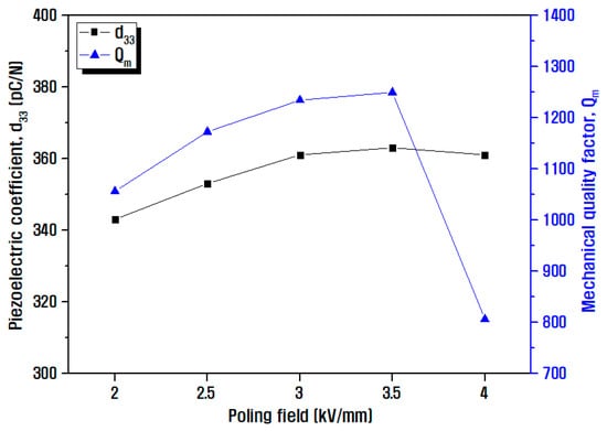 Electrical properties measurement results of the ceramic represented by d33 and Qm with respect to the poling field.