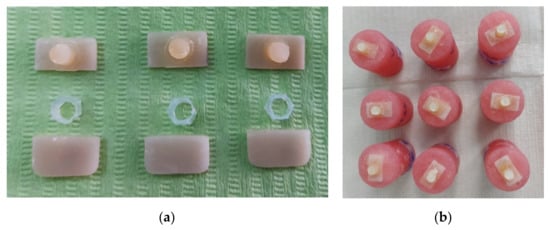 A custom-made silicone cylinder mould with dimensions of 3 cm × 4 cm was filled with acrylic resin (Superacryl Plus, SpofaDental, Jičín, Czech Republic), and the ceramic-adhesive assembly was embedded in the resin, (Figure 1b).