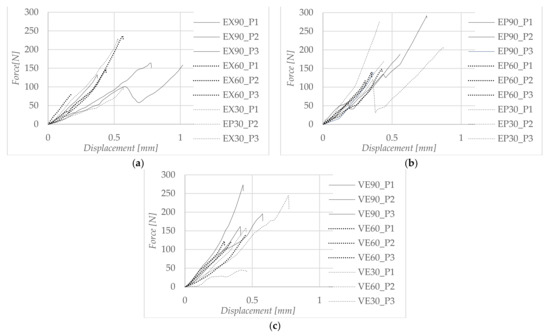 Force–displacement curves for some representative specimens. (a) Sample of EX: 9.5% HF for 30 s, 60 s and 90 s; (b) sample of EP: 9.5% HF for 30 s, 60 s and 90 s; (c) sample of VE: 9.5% HF for 30 s, 60 s and 90 s.