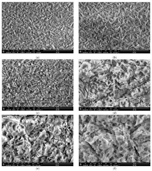 The etched surfaces under the SEM examination for EX (Figure 3a–c) appeared to be needle-shaped, revealing the crystals’ size, form and orientation. The images did not expose significant differences among the three groups of EX, but the depth of the pattern increased with the etching time. SEM images for EP (Figure 3d–f) and VE (Figure 3g–i) showed the glassy matrix removal and exposed the substrate morphology.