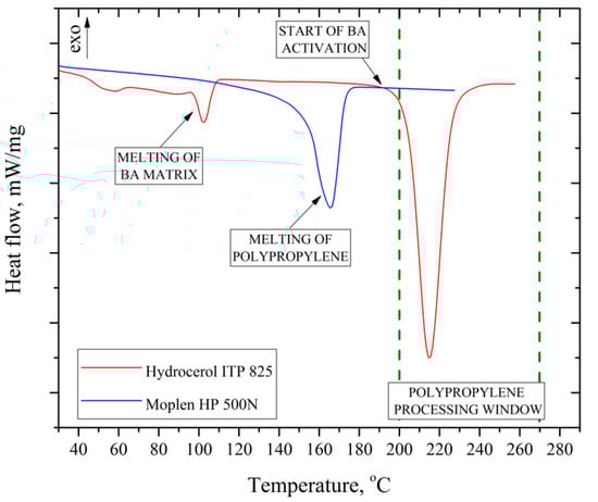 Figure 1 recorded during the differential scanning calorimetry (DSC) test. The characteristics of the selected blowing agent allowed for effective cellular injection in the temperature range of the PP “processing window”.