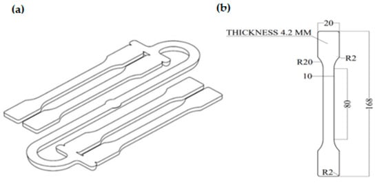 3 and a screw diameter (D) of 35 mm. The machine was equipped with a four-cavity injection mold with a cold runner, allowing the production of universal test samples (dog-bone shape) with a geometry compliant with the ISO 3167:2014 standard (type A). The model of the molding and a single sample are shown in