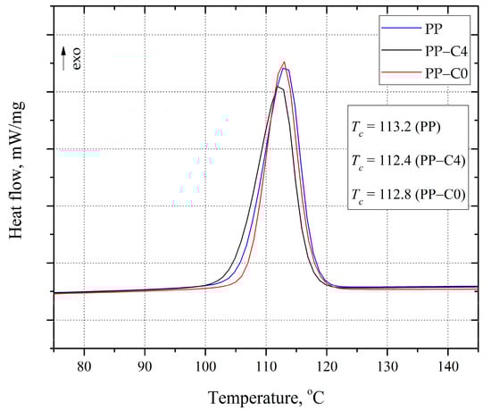 Figure 4), it was found that the residues after thermal decomposition of the blowing agent did not cause heterogeneous nucleation of the modified PP. This is indicated by the lack of a crystallization temperature (Tc) shift of the PP-C4 and PP-C0 samples compared to the solid PP sample. The crystallization temperature of all tested samples ranged from 112.4 °C to 113.2 °C.