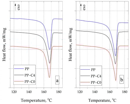 Figure 5). The melting point of all samples that were tested after 1 h of conditioning ranged from 167 °C to 168 °C. The crystallinity degree of the solid sample and samples with a porous structure was approximately 39%, which results from similar values of the melting enthalpy. After 840 h of conditioning, an increase in Xc for all types of materials was recorded. The recorded values ranged from 41.9% for PP-C4 to 43.0% for PP-C0. The exact values of the parameters tested for each of the compositions are presented in