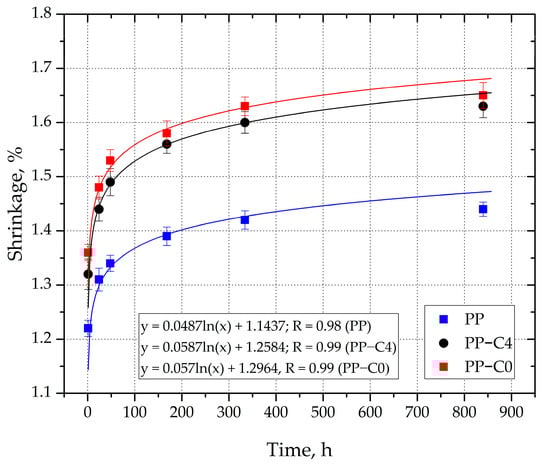 Figure 7). Moreover, 24 h after removing the moldings from the injection mold, the linear shrinkage of PP samples (primary shrinkage) reached the value of 1.31%, while in the case of PP-C4 and PP-C0 samples the values were higher by 9.9% (S = 1.44%) and 13% (S = 1.48%), respectively. The length of the samples gradually decreased during the conditioning. For example, the shrinkage value of the PP sample after 840 h was equal to 1.44%, which corresponds to a reduction in length compared to the measurement after 24 h by 0.22 mm. Such large changes in the dimensions of moldings during conditioning may limit the use of this type of materials in construction areas.