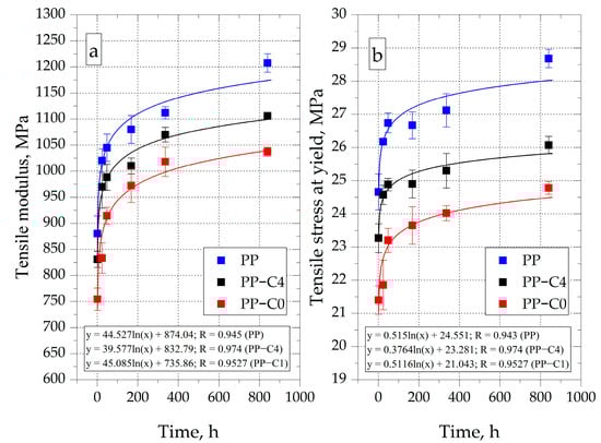PP samples with a porous structure were characterized by a lower value of the Young’s modulus compared to the solid material. The E value of PP-C0 samples after 1 h of conditioning was equal to 754 MPa, which is about 14% less compared to the value determined for PP after the same conditioning time. Along with the extension of the conditioning time, as in the case of solid PP, a gradual increase in the value of the elastic modulus of PP-C0 samples was recorded. After 840 h, the Young’s modulus of this material was equal to 1037 MPa, which is also 14% less than in the case of unmodified PP.