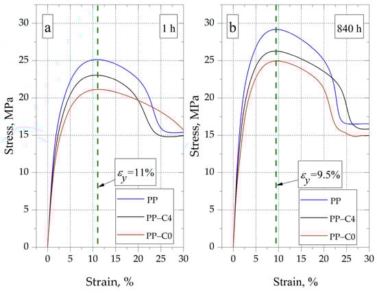 The effect of changes in the modulus of elasticity and stress at yield due to the increase in the degree of crystallinity of PP is also clearly visible in the example tensile curves recorded after 1 and 840 h of conditioning presented in