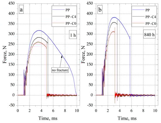 Figure 10a,b). In the case of the PP-C0 sample conditioned for 1 h, the cracking occurred after less than 5 ms of the test. Conditioning for 840 h shortened the time of destruction to about 3 ms. Awareness of the increase in brittleness of PP with a porous structure along with the conditioning time to remove the molded parts from the injection mold is crucial for the right material for a given application. Based on the analysis of the test results, it can be concluded that passing the quality control tests by PP moldings, which are carried out immediately after the production process or within the next several hours, does not have to guarantee that the product will carry the assumed loads already at the operating stage.