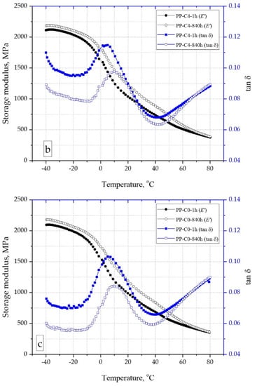 Figure 11a–c), it was found that PP moldings with a porous structure are characterized by a lower value of the storage modulus (E’) compared to solid PP samples. The differences were recorded over the entire temperature range of the test. As in the case of Young’s modulus, the increase in porosity of the moldings resulted in a decrease in the E’ value. For example, at the temperature of 23 °C after 1 h of conditioning, the storage modulus of PP samples (1006 MPa) was higher by about 8% compared to the PP-C0 samples (930 MPa). After 840 h of conditioning, a significant increase in the value of the conservative modulus was recorded, in particular in the temperature range from −10 °C to 50 °C, i.e., in the range close to the operating temperature. The increase in E’ between 1 h and 840 h of conditioning for the temperature of 23 °C was from 16% for PP to 20% for the PP-C0 samples.