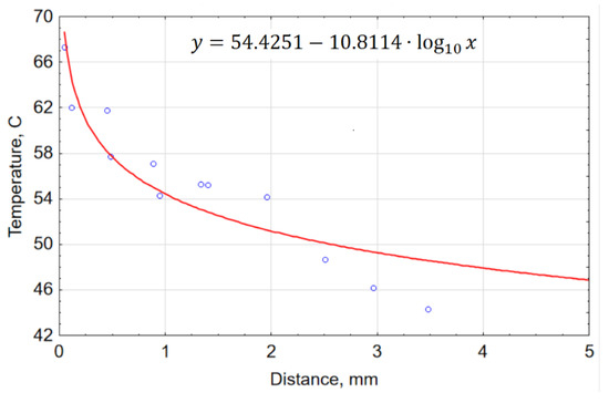 Only the maximum temperatures registered by the thermocouples were considered. The data were used to calculate the theoretical temperature at the edge. The plot in Figure 3 shows the relationship between the temperature and the distance from the edge.
