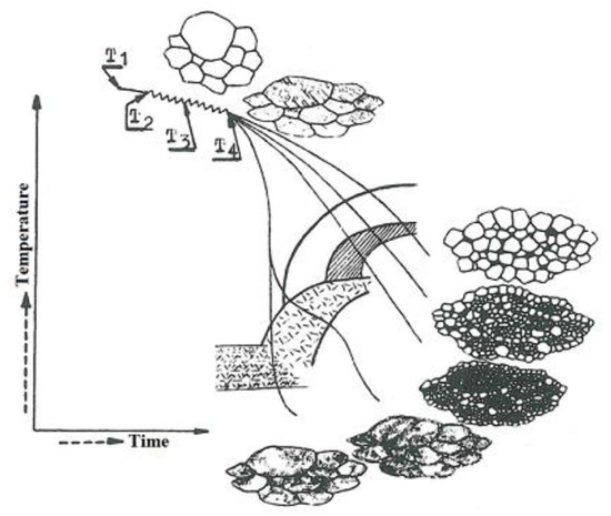 The phenomena caused by heat transfer in the jet impact zone resemble those observed during heat treatment processes. A properly selected heat treatment process ensures a desirable microstructure of a material, which strongly affects its mechanical properties. Hot metalworking can also contribute to microstructure changes. As indicated in [26], the type of microstructure depends on both the process temperature and the cooling rate. Figure 4 shows the types of microstructures of steel obtained in controlled rolling, according to the cooling rate. As can be seen from Figure 4, rapid cooling of steel is responsible for a coarse-grained microstructure, while at a lower cooling rate fine-grained sorbite or troostite occurs.