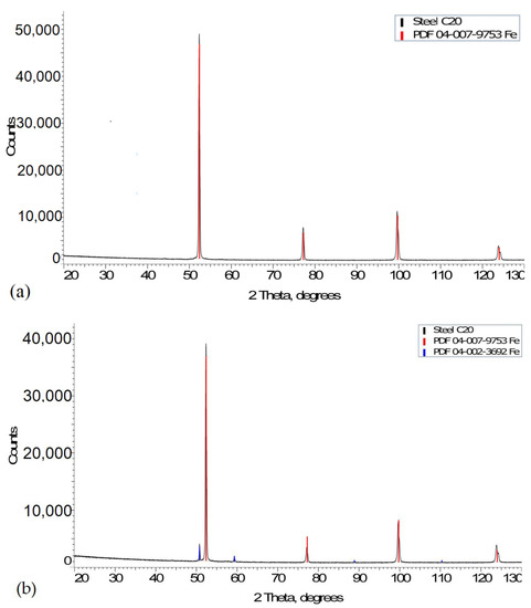 The time–temperature transformation (TTT) diagrams (Figure 4) were used to carry out an XRD analysis of the phase composition of the material along the edge and in the base metal zone. The X-ray diffraction analysis data were useful to determining the changes in the parameters of the crystallographic lattice, the size of subgrains (crystallites), and the phase composition. Figure 5 shows the diffraction patterns obtained through the qualitative XRD analysis to identify the phases present.