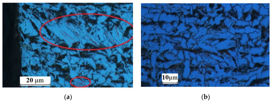 After the cutting, the material close to and along the edge had a fine-grained microstructure with smaller ferrite subgrains. A large number of such subgrains formed in the ferrite grains, as shown in Figure 6. The formation of the fine-grained structure, observed up to about 40 µm from the line of cut, was due to the occurrence of temperatures higher than the eutectoid temperature. After cutting with an abrasive water jet, the partially strand-like pattern of dark grains of pearlite and light grains of ferrite is no longer present. At larger distances, i.e., 50–150 µm from the line of cut, the average size of ferrite grains increases.