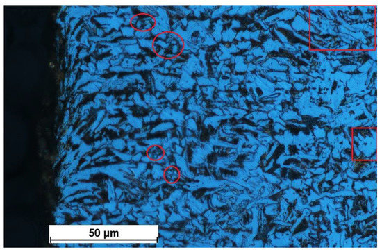 The dark regions in Figure 9 indicate the occurrence of lower bainite or very fine upper bainite. Upper bainite has a needle-like structure with carbide precipitates, which dissipate light.