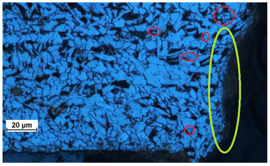 Recrystallization (red circles and yellow circles—at the cutting edge) in the microstructure of a metallographic specimen.
