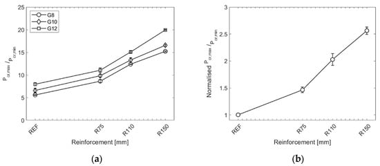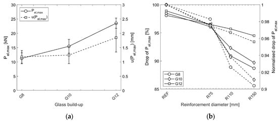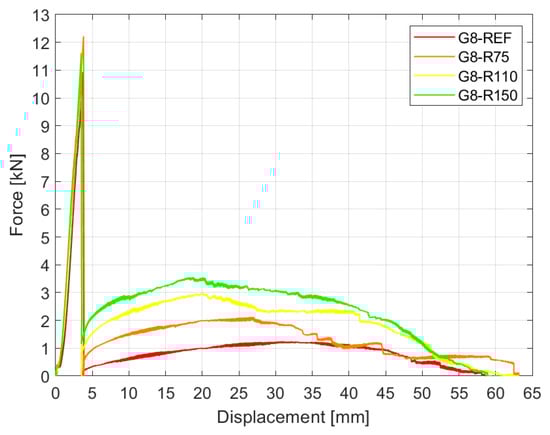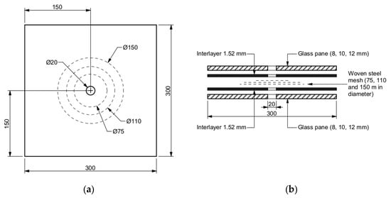 - Regarding the monotonic loading experiment, the load increase after glass breakage was observed for all specimens; however, the reinforced specimens with embedded steel mesh showed significantly improved post-breakage capacity. It was found that the local reinforcement in the direct vicinity of the hole in glass increased the post-breakage strength by 46.3%, 102.6%, and 156.2% for the reinforcement diameters of 75 mm, 110 mm, and 150 mm, respectively. All samples failed at the average value of 63.63 ± 0.91 mm, indicating that the ultimate failure is related to the damage to the interlayer rather than the reinforcing mesh.