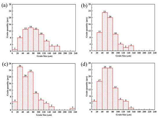 Histogram of the grain size distribution of (a) ZL205A alloy, (b) ZL205A + 0.1%La alloy, (c) ZL205A + 0.3%Al–5Ti–0.8C alloy, and (d) ZL205A + 0.1%La + 0.3%Al–5Ti–0.8C alloy.