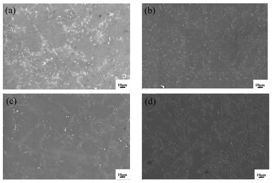 Figure 4 shows the microstructure of ZL205A alloy with composite addition of 0.1%La + 0.3%Al–5Ti–0.8C and single additions of 0.3%Al–5Ti–0.8C and 0.1%La after T5 heat treatment. For the ZL205A, the undissolved phase was also larger and distributed along the grain boundaries, and the precipitated phase was coarse. When 0.3%Al–5Ti–0.8C was added (Figure 4b), the precipitated phase was obviously refined and uniformly dispersed. For the ZL205A alloy with 0.1%La (Figure 4c), the precipitated phase was finer and more uniformly distributed than the unmodified alloy. When 0.1%La + 0.3%Al–5Ti–0.8C (Figure 4d) were added, the precipitated phase was smaller than that of the alloy with Al–5Ti–0.8C and La.