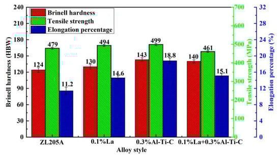 The mechanical properties of the alloys are shown in Figure 5. After T5 heat treatment, the hardness of the alloy with the addition of 0.1%La + 0.3%Al–5Ti–0.8C was 140 HBW, and the tensile strength and elongation were 461 MPa and 15.1%, respectively. The hardness and elongation were 12.9% and 34.8% higher than those of the unmodified alloy, respectively, 7.7% and 3.4% higher than that of the alloy with 0.1% La, respectively, but the tensile strength was lower than that of the unmodified alloy and the alloys with 0.1%La or 0.3%Al–5Ti–0.8C.