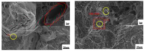 In Figure 8b, the elongation of the alloy decreases with increasing temperature. This is because V, Ti, Zr, and other elements in the ZL205A alloy form insoluble Al3V, Al3Ti, Al3Zr, and other intermetallic compounds, which are easily enriched on the grain boundaries. As the temperature increases, the grains coarsen and the grain boundaries begin to soften, weakening the bonding between the grain boundaries. Intermetallic compounds enriched at grain boundaries hinder grain boundary deformation, causing cracks to propagate along fragile grain boundaries. With the increase in temperature, the fracture dimples become larger and the elongation decreases.