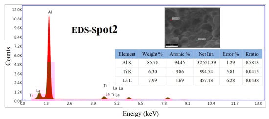 Figure 6 shows the fracture surface of the T5 heat-treated alloys after room-temperature tensile tests. The unmodified alloy has a large number of fractures along the grain and a small number of shallow and small dimples near the grain boundaries, as shown in Figure 6a. After the addition of 0.1%La, the fracture surface of the alloy changed significantly, with an increase in the number of small and deep dimples, and a small amount of intergranular fracture, as shown in Figure 6b, while a small amount of fine Al–La phase was observed on the fracture surface (the EDS result of the red area B in Figure 6b is shown in Figure 7). When 0.3%Al–5Ti–0.8C was added, the number of dimples increased and the size decreased significantly. When adding 0.1%La + 0.3%Al–5Ti–0.8C, more and smaller dimples were observed, and a small amount of Al–La phase appeared in a round cake shape.