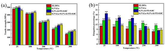 The mechanical properties of the ZL205A alloy with the addition of La and Al–5Ti–0.8C at different temperatures are shown in Figure 8. The tensile strength of the ZL205A alloy at 300 °C was 144 MPa and the elongation was 7.8%; the tensile strength of the alloy with the addition of 0.1%La increased by 16.7% and the elongation by 47.4% compared to the unmodified alloy; the addition of 0.3%Al–5Ti–0.8C increased the tensile strength at 300 °C by 23.6% and the elongation by 8.97% compared with the unmodified alloy; the tensile strength at 300 °C increased by 31.9% and the elongation increased by 12.8% compared with the unmodified alloy when adding 0.1%La + 0.3%Al–5Ti–0.8C, and in this treatment the tensile strength increased by 13.1% and elongation decreased by 23.5% compared to the alloy with 0.1%La, while the tensile strength increased by 6.7% and elongation increased by 3.5% compared to the alloy with 0.3%Al–5Ti–0.8C. It can be seen that the composite of Al–5Ti–0.8C and the rare-earth element La improves the high-temperature strength of ZL205A significantly.