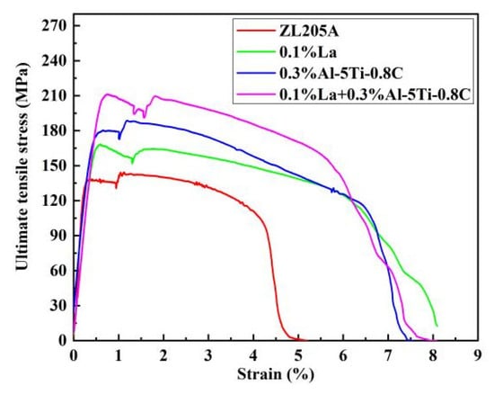 Figure 9 shows the tensile stress–strain curves of the ZL205A alloy with the additions of La and Al–5Ti–0.8C at 300 °C. Work hardening occurred during deformation, along with softening caused by dynamic recrystallization, and the ZL205A alloy with the addition of 0.1%La + 0.3%Al–5Ti–0.8C had the most significant increase in high-temperature tensile strength.