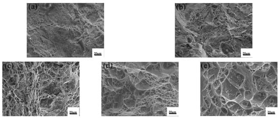 Tensile fracture morphology of ZL205A alloy with 0.1%La + 0.3%Al–5Ti–0.8C at different temperatures: (a) 25 °C, (b) 100 °C, (c) 200 °C, (d) 250 °C, and (e) 300 °C.
