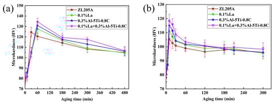 To explain the high-temperature strengthening of ZL205A alloy with the addition of Al–5Ti–0.8C and La composite, the age–hardening curves of the alloy at 250 and 300 °C were measured, as shown in Figure 12. At 250 °C, the time to reach the aging peak changed between the unmodified alloy and the alloy with the addition of 0.1% La and 0.3%Al–5Ti–0.8C. The time to reach peak hardness for the unmodified alloy was 30 min, with a peak hardness of 125HV. The aging time to peak hardness for the alloys with 0.1%La and 0.3%Al–5Ti–0.8C was 1 h, which was 30 min longer than that for the unmodified alloy. The peak hardness for the alloy with 0.1%La was 128HV, while for the alloy with 0.3%Al–5Ti–0.8C the peak hardness was 131HV, and the peak hardness of the alloy with 0.1%La + 0.3%Al–5Ti–0.8C was 135HV.