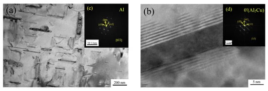 Bright-field image and HRTEM image of the unmodified ZL205A alloy after T5 treatment: (a) bright-field image, (b) θ’-phase HRTEM image, (c) diffraction pattern of the α phase, and (d) diffraction pattern of the θ’ phase.