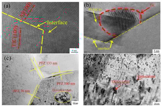 TEM bright-field image and HRTEM image of ZL205A alloy with 0.3%Al–5Ti–0.8C + 0.1%La: (a) the interface of Al and TiC, (b) θ’(Al2Cu)-dependent TiC precipitation, (c) PFZ (Precipitation Free Zone) area, and (d) dislocations near θ’(Al2Cu).