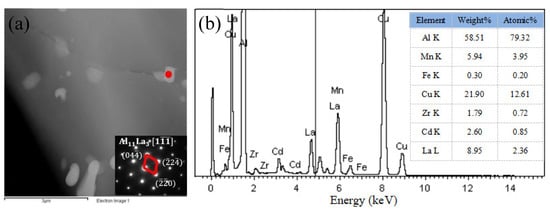 Due to the addition of the rare-earth element La, a certain amount of Al–La phase is formed in the ZL205A alloy after aging. In order to confirm the microstructure of the Al–La phase, transmission electron microscopy and electron energy spectrum analysis were carried out. Figure 16 shows the electron energy spectrum results and electron diffraction spots (dark field) of the Al–La phase. Through analysis, it was confirmed that the block lanthanum-rich phase is an Al11La3 phase and its size is submicron. This phase is dispersedly distributed in the matrix and acts as a pinning dislocation.