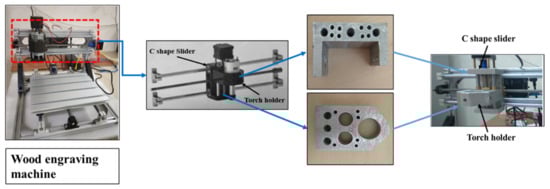 A low-cost wood engraving machine was converted into a metal 3D printer to lower the cost (Figure 1). This machine is built with plastic parts; as they cannot withstand the high temperature during metal deposition, they were replaced by metal parts. These metal parts were made of 6061 aluminum alloy using sand casting to reduce the overall load on the stepper motor that came with the machine.