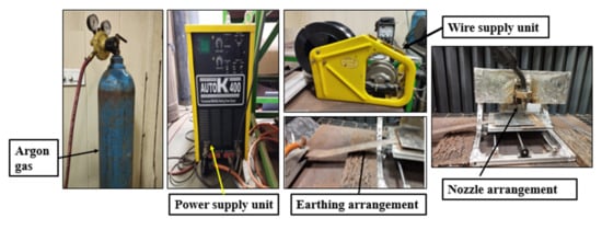 A mild steel plate (S235JR) with dimensions of 100 mm × 100 mm × 3 mm was used as the substrate material. Mild steel was chosen because it is readily accessible and inexpensive, yet it has inferior mechanical properties compared with stainless steel, despite being the most widely used as industrial steel. The wires used were mild steel (G3Si1) welding wire and austenitic stainless steel (SS304) wire with a diameter of 1.2 mm. Table 2 shows the chemical composition of the wires. The materials were deposited one after another rather than simultaneously. Stainless steel is a highly recommended material for structural applications in nuclear industries, power plants, heavy load engineering applications, high-temperature vessels, construction, and various other industrial uses due to its wide range of mechanical and physical properties. Because of its superior mechanical properties, stainless steel can be used directly in buildings; nevertheless, the cost of such structures is higher due to the high material cost of stainless steel. Stainless steel can be used in structural building with the help of mild steel via dissimilar joining, which produces reasonable results. The stainless steel is corrosion-resistant, and the Ni is added to it, which makes the stainless steel ductile. Some elected properties of mild and stainless steel are presented in Table 3 [21]. Proper metallurgical bonding is required at the interface point when combining these two materials.